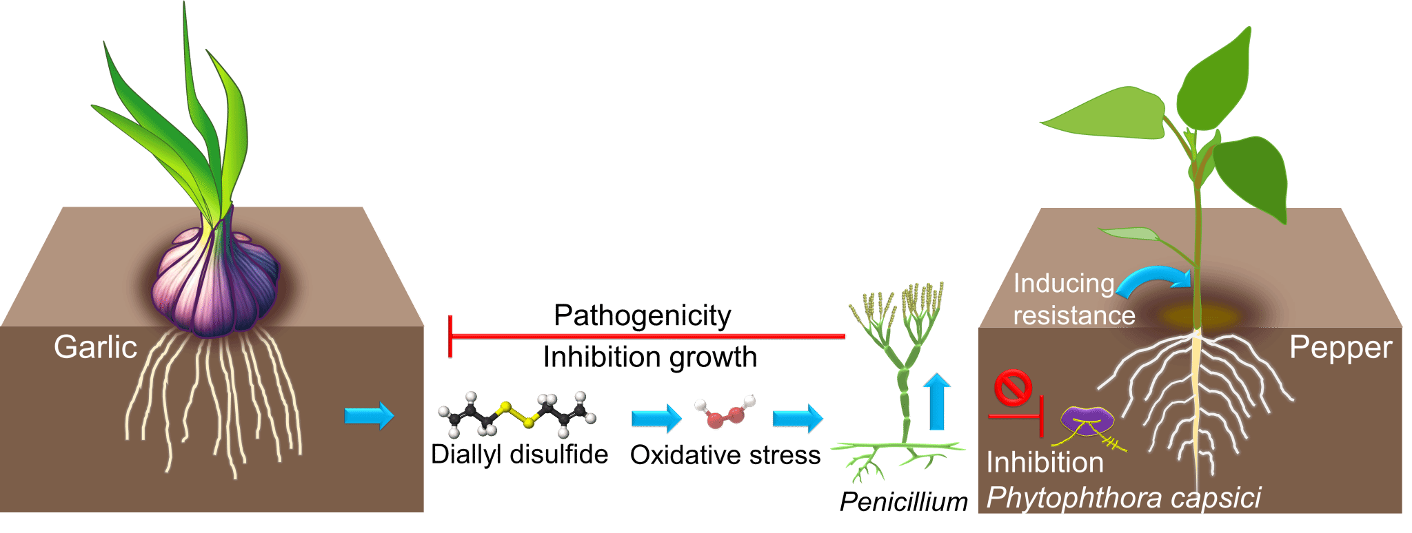 本站消息 9月2日,學(xué)校植物保護(hù)學(xué)院朱書生教授團(tuán)隊在Plant Communications(影響因子11.6)上在線發(fā)表了關(guān)于輪作系統(tǒng)中土傳病害可持續(xù)管理的研究論文“An altruistic rhizo-microbiome strategy in crop rotation systems for sustainable management of soil-borne diseases”。本文以大蒜-辣椒輪作系統(tǒng)為研究對象,發(fā)現(xiàn)大蒜根系分泌物DADS能夠誘導(dǎo)土壤微生物產(chǎn)生ROS脅迫,從而富集耐ROS脅迫的大蒜青霉菌(Penicillium allii)。這一微生物群落變化對后續(xù)其他作物的生長具有利他效應(yīng),但對大蒜自身具有一定負(fù)效應(yīng)。研究揭示了大蒜這種自我犧牲式的“利他”根際微生物組調(diào)控策略,為作物輪作系統(tǒng)中土傳病害的定向和可持續(xù)治理提供了新思路。