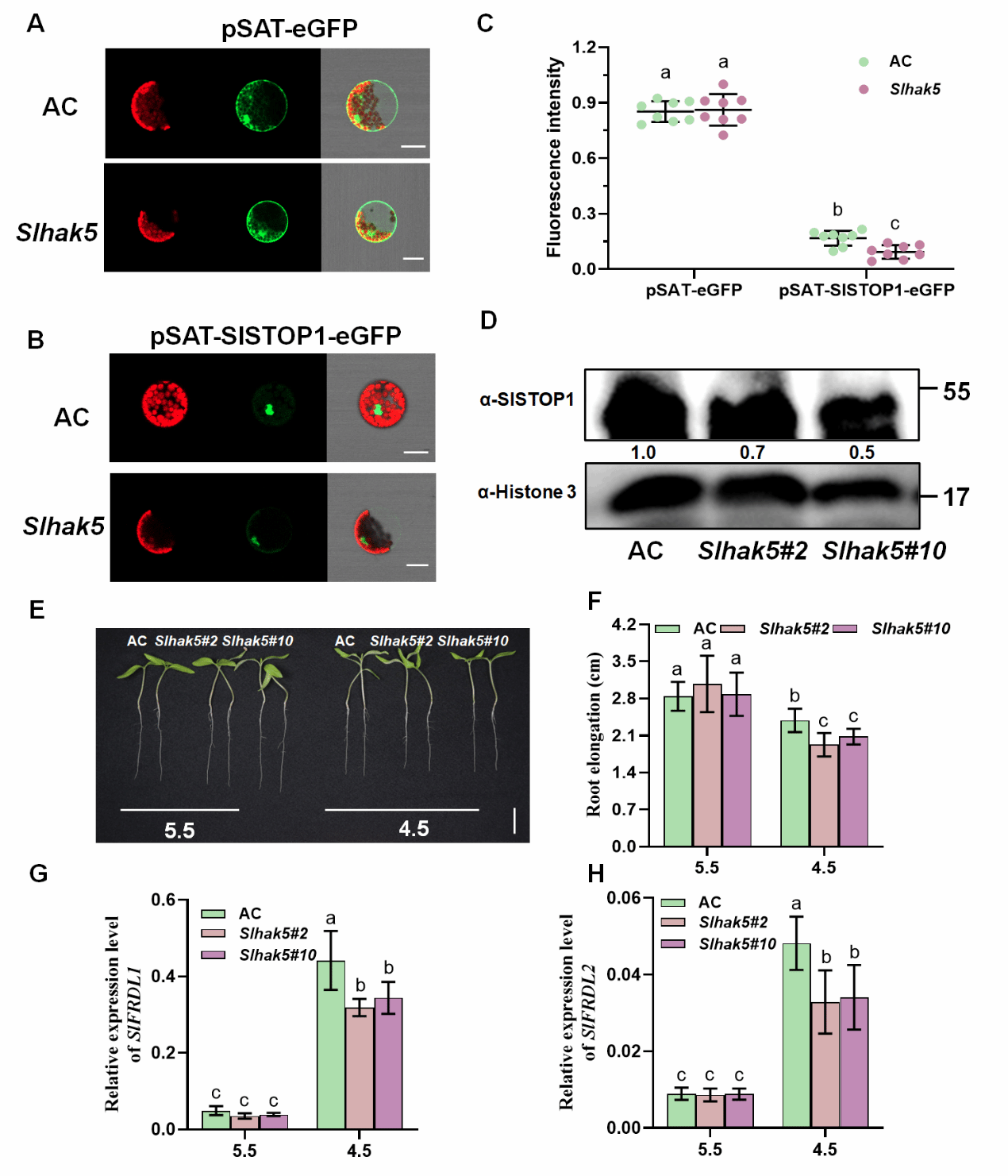 酸性土壤約占全球耕地的40%,當pH值低于5.5時,土壤中的鋁會以毒性Al3+形態釋放,嚴重抑制植物根系生長,最終導致不同作物25-80%的產量損失。SENSITIVE TO PROTON RHIZOTOXICITY1 (STOP1) 轉錄因子是植物應對酸鋁毒害的核心調控因子,但酸和鋁信號如何協同調控其蛋白穩定性的分子機制仍然不清楚。本研究綜合運用熒光探針法和非損傷微測技術,發現鋁脅迫誘導的根尖胞質酸化是SlSTOP1蛋白積累的關鍵因素。進一步通過比較轉錄組分析發現,SlHAK5能夠同時受鋁毒和酸脅迫的誘導表達,并介導鋁脅迫下胞質pH穩態來反饋調節SlSTOP1蛋白穩定性。研究成果豐富了現有SlSTOP1-SlHAK5調控機制的認知,為培育適應酸性土壤的作物新品種提供了理論依據。