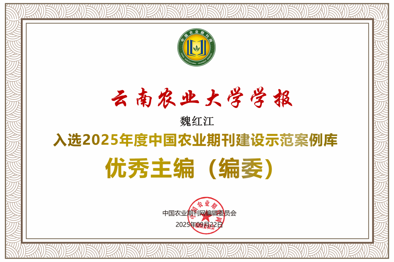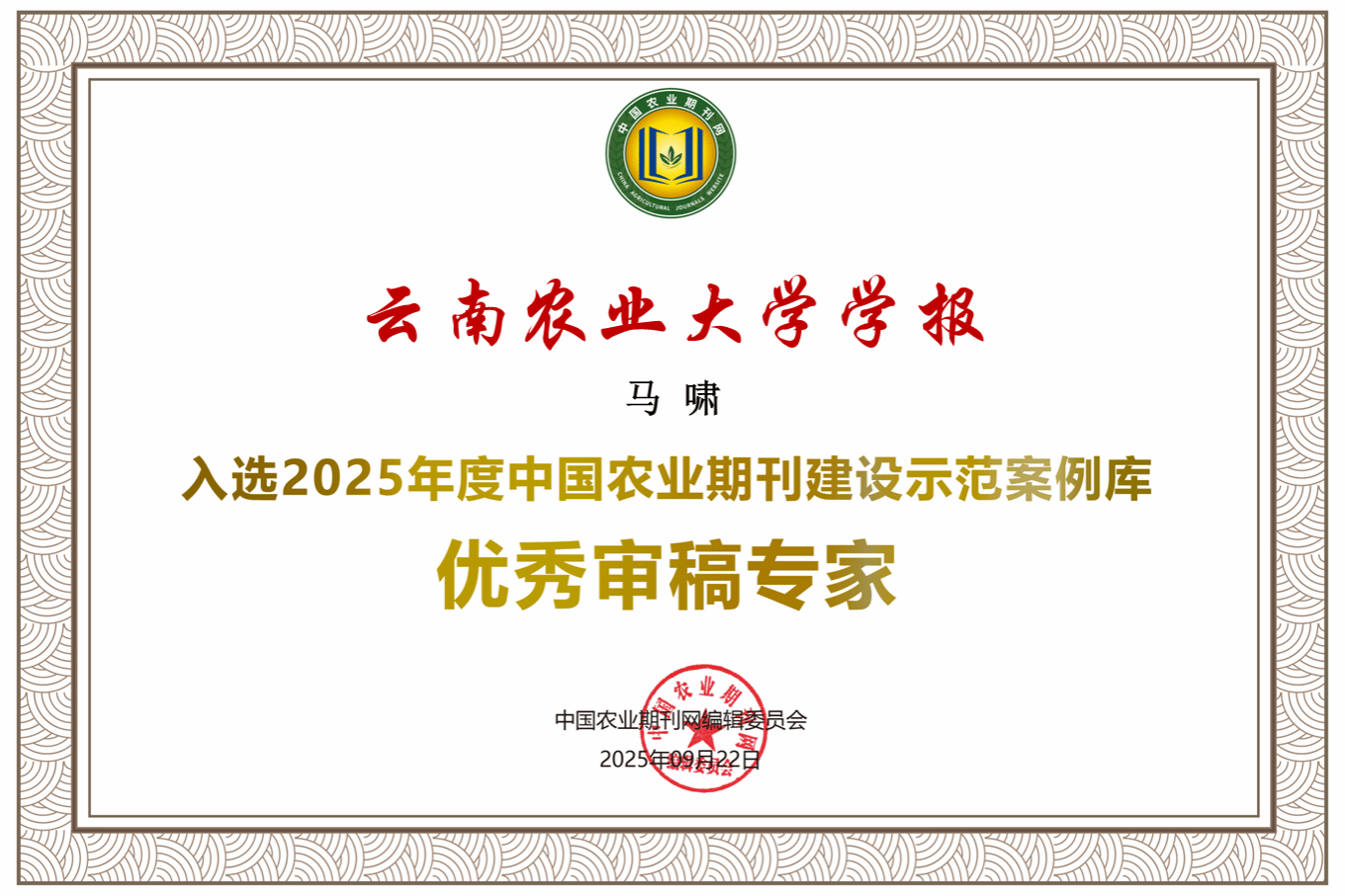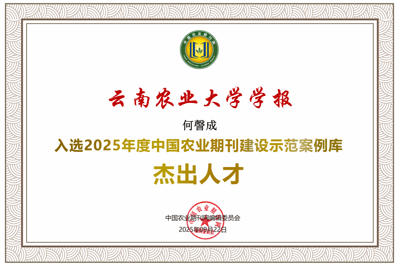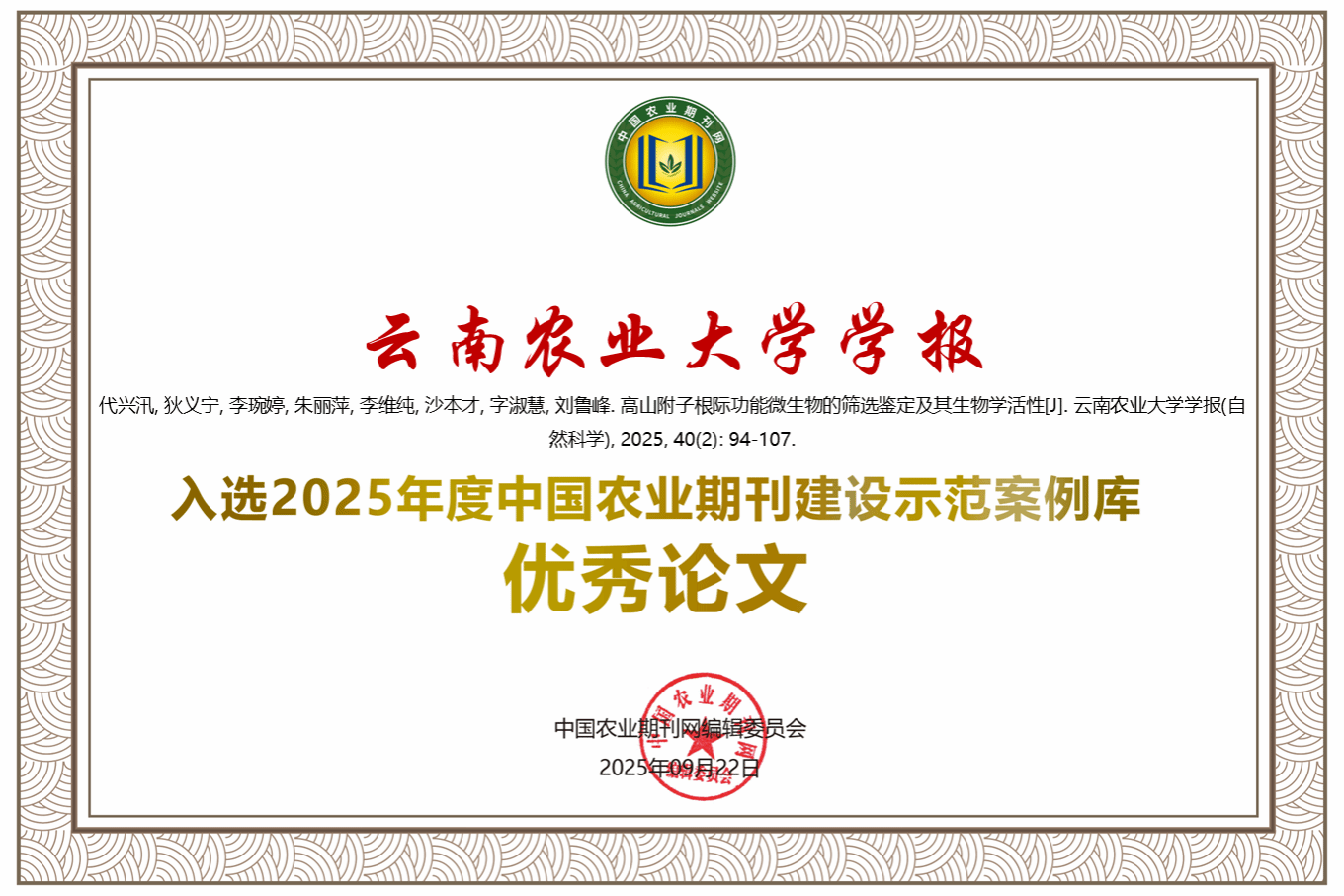 《云南農業大學學報》編輯部榮獲“2025年度中國農業期刊建設示范案例庫優秀團隊”。學校魏紅江教授和馬嘯教授分別被評為“2025年度中國農業期刊建設示范案例庫優秀編委”和“優秀審稿專家”。編輯部何謦成副編審被評為“2025年度中國農業期刊建設示范案例庫杰出人才”。刊載論文《高山附子根際功能微生物的篩選鑒定及其生物學活性》被評為“2025年度中國農業期刊建設示范案例庫優秀論文”。